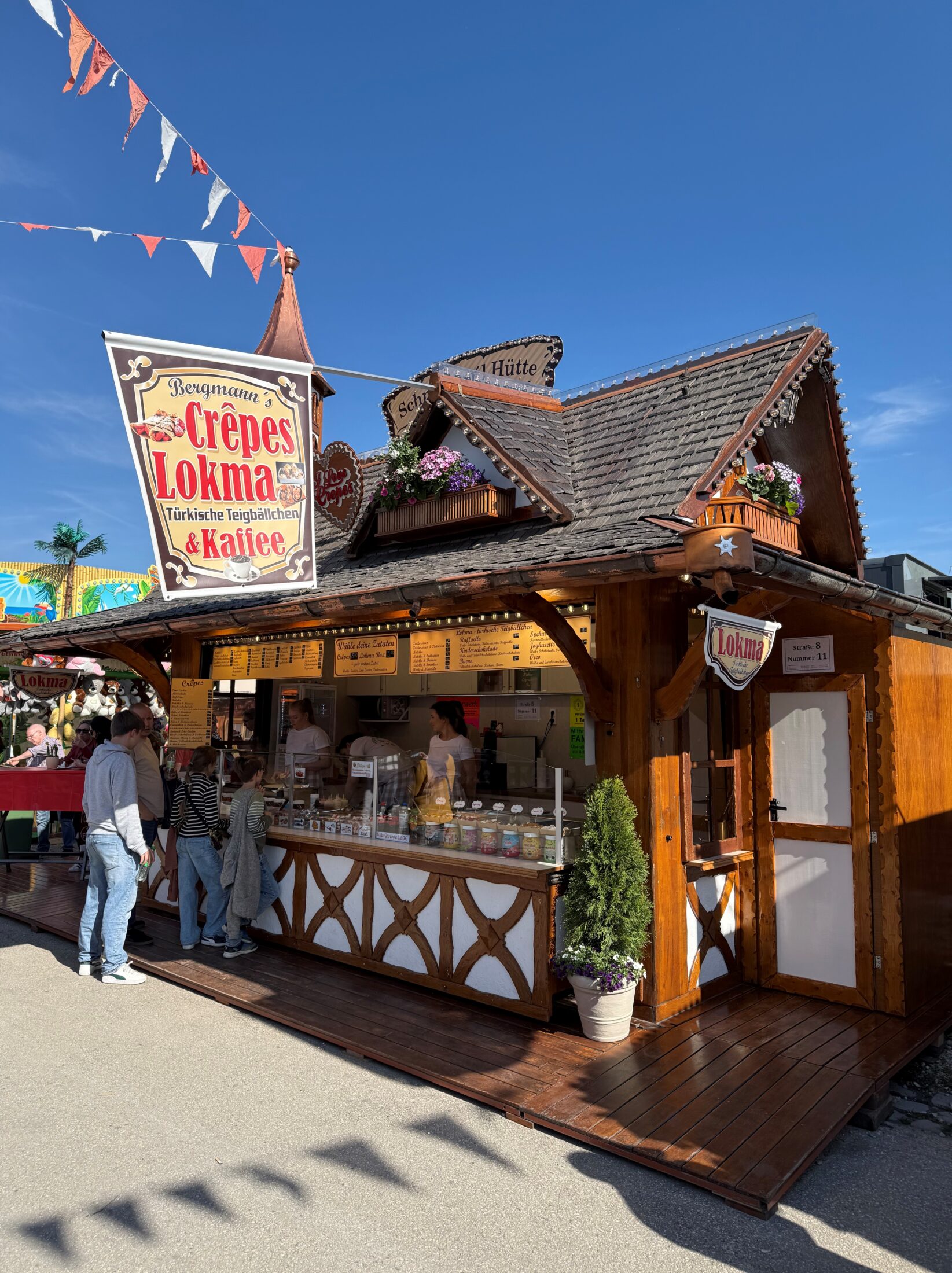 Unser liebevoll gestalteter Stand im Hüttenstil bietet euch eine besondere Kombination aus traditionellen türkischen Lokma, frisch gebackenen Crêpes in vielen Variationen und aromatischem Kaffee. Hier trifft orientalische Süßspeise auf französisches Crêpe-Handwerk – immer frisch zubereitet, mit einem Lächeln serviert.